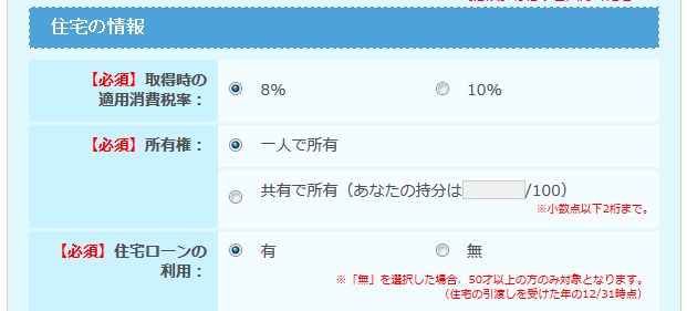 A住宅の取得時の消費税率、所有の人数と所有持ち分を記入、住宅ローンは有を選ぶ